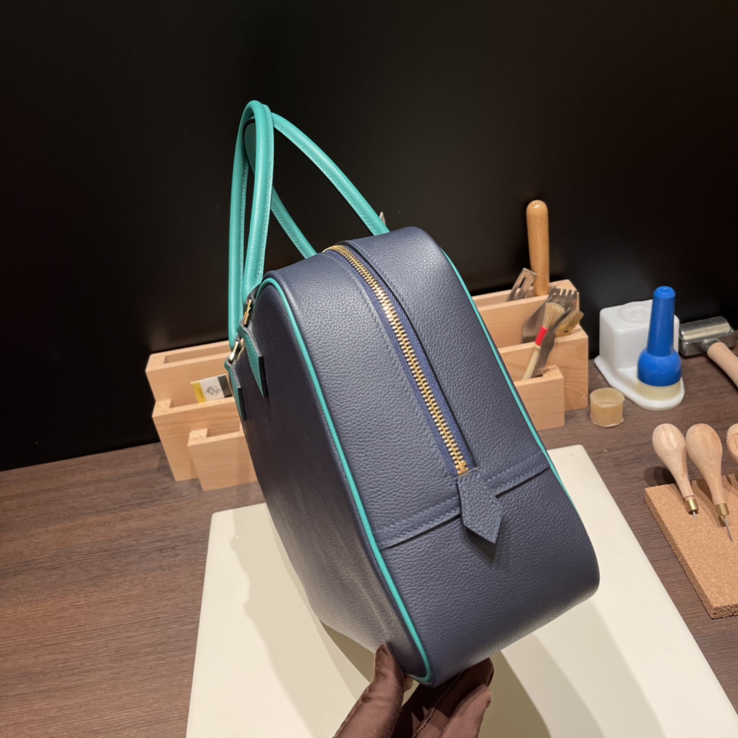 Hermès Plume 32 Evercolor 73/Blue Saphir X Vert Verone Silver Hardware Plume-002 Fully Hand-Stitched