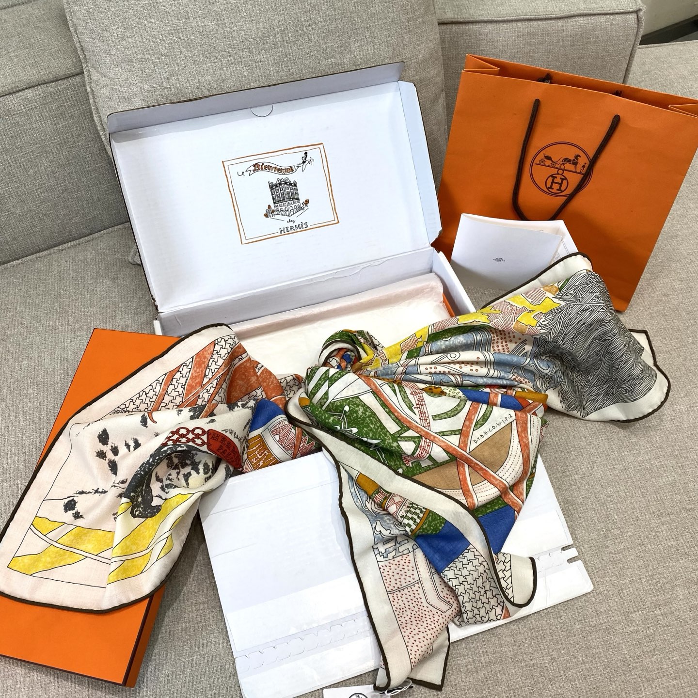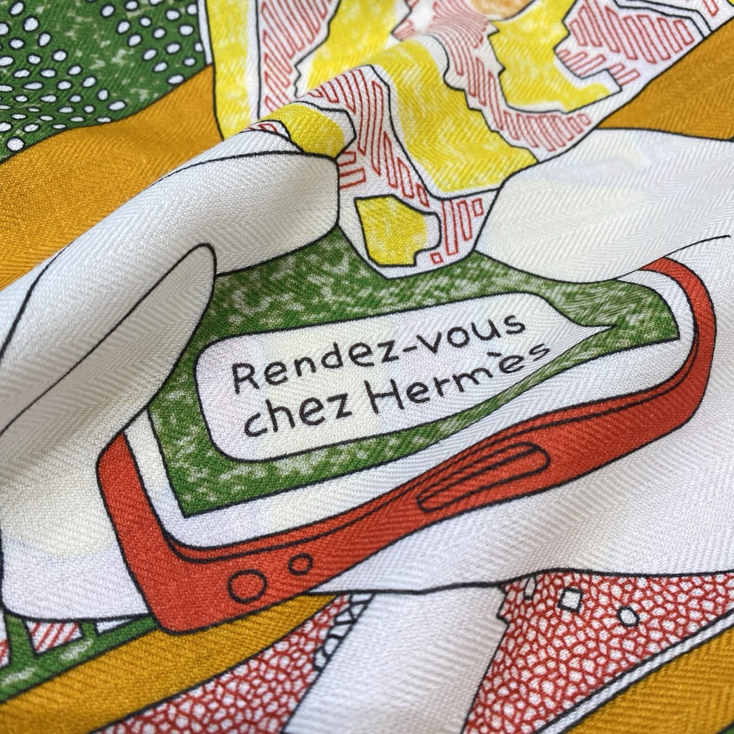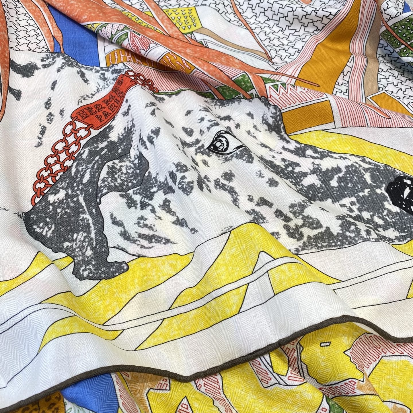 優雅な女性はどんな秘密のデートの準備をしているのでしょう急ぎ足で鍵をポケットに収める様子に、想像が膨らみます。忠実なダルメシアン(大麦町犬)が本棚のそばで辛抱強く待っていますが、これも物語の一筋の糸となっているのでしょうか?カリーヌ・ブランコヴィッツ(Carine Brancowitz)は、このスカーフにパリでの学生時代の華やかな夢を描き込みました。この若きデザイナーは当時ラテン・クォーター(拉丁区)に住んでいた頃、近所の人々の秘密めいた生活を想像することが常で、白昼夢の中でロマンチックなドラマを繰り広げていました。街角で突然響く一音一音の音符、窓から漏れる一編一編の詩、床に響く優しい足音 —— これらすべてが新しい手がかりとなり、彼女はこれら見知らぬ人々の様々な生活の姿を想像することを愛でていました。