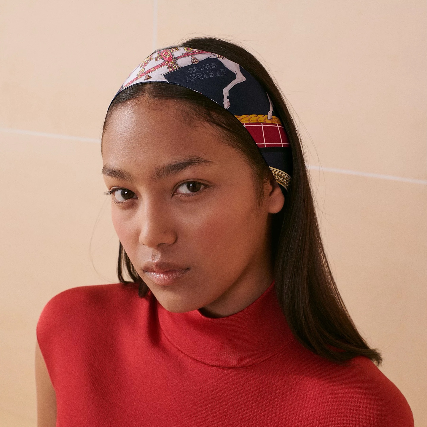 「「グランドアパラット(Grand Apparat/盛宴)」スカーフのデザインからインスピレーションを受けて制作された本作品は、パレード(游行)や祝典を飾る様々な華やかな手綱(鞍辔)とサドル(马鞍)を演绎しています。高級感あふれるエンボスレザー製の手綱には、フリンジ(流苏)または編みロープ(编绳)が装飾され、ブロンズ元素(青铜元素)、月桂樹の葉(月桂叶)、王室の紋章(皇家徽章)、盾紋章(盾徽)が点在することで、馬車の主人の尊厳な身份とイベントの重要性を際立たせています。作品中央の柄は、ピラミッド型のリベット(金字塔形铆钉)とリボン(饰带)を介して周囲の柄と連なっており、そのデザインの源はルイ 18 世の戴冠式で登場した駿馬の姿に由来しています。