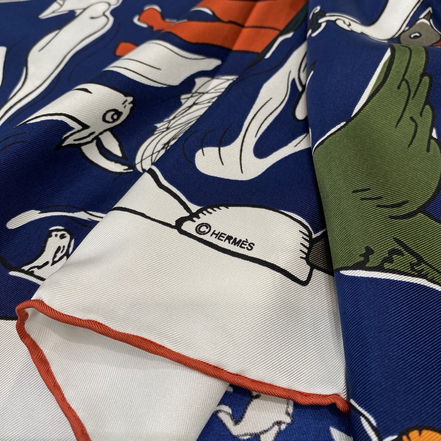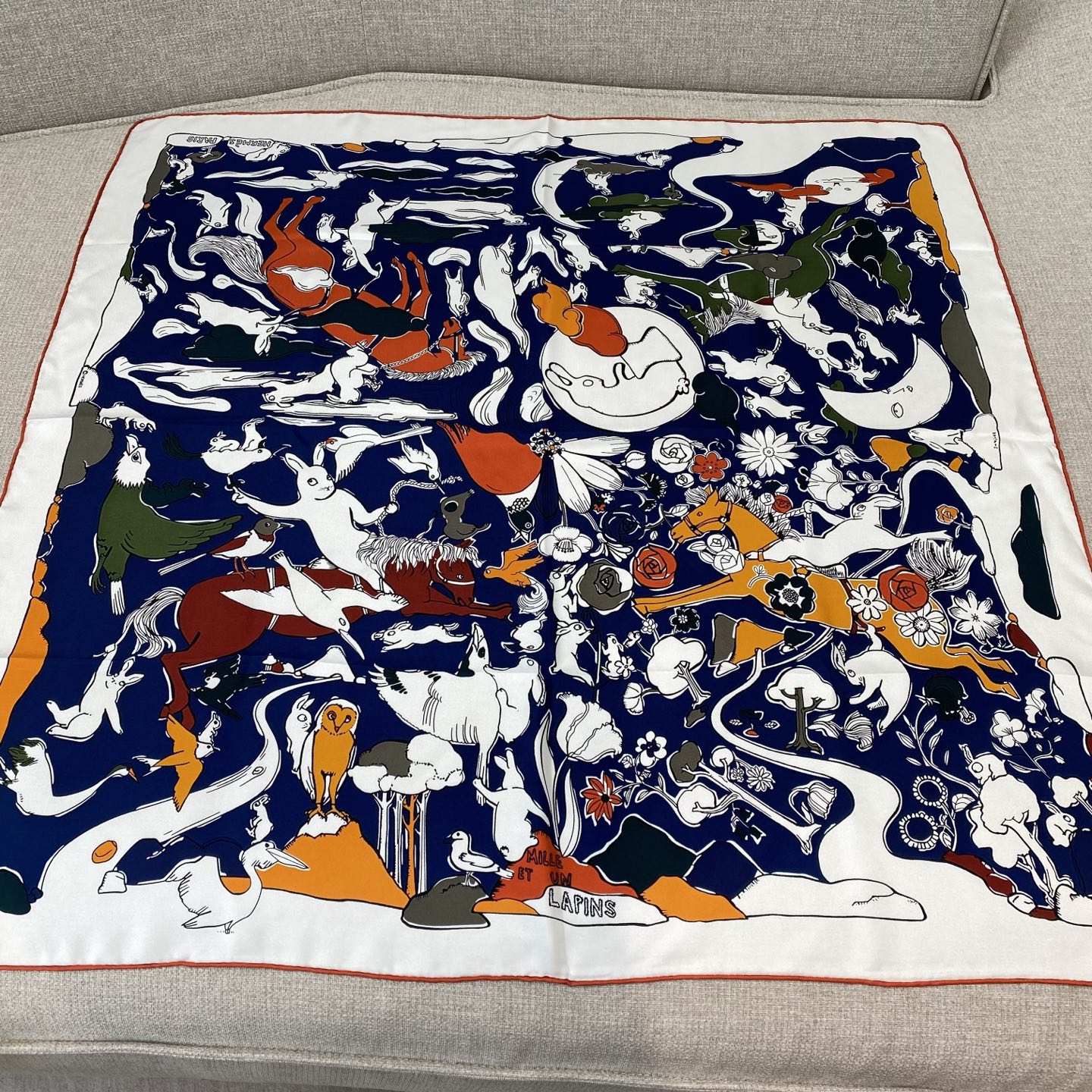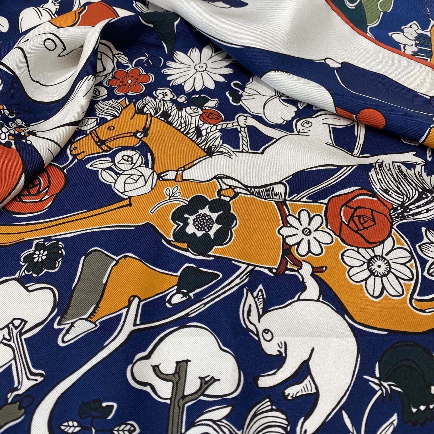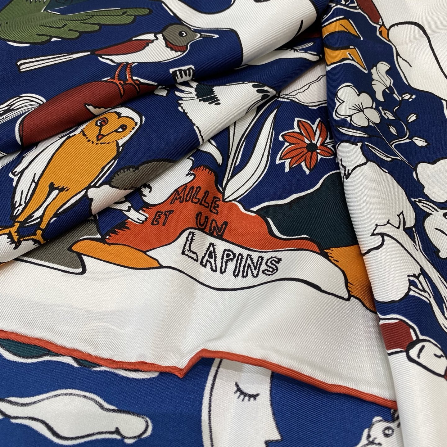 「Mille et un lapins(ミーユ・エ・アン・ラパン)」スカーフのデザインからインスピレーションを受けて制作:魔術師は帽子の中からウサギを一頭取り出す方法を知っていますが、カワハラシンスケ(信介河原/Shinsuke Kawahara)は自身の筆から、いったいどれだけのウサギを生み出せるのでしょう?彼はあまりにも多くのウサギを創り出し、まるで「ウサギの雨」が降ってくるような光景となり、これらのウサギたちは自然の風景の中で嬉しそうに跳ね回っています。小さなウサギたちは興奮して、馬の群れの中にさえ混乱を引き起こしています。馬たちは本来、次の障害走りの試合の前にゆっくり休むつもりでいました。しかし、ウサギたちこそが本当の跳躍の達人だとは思いもしませんでした。誰が一番高く跳べるのでしょう?賭けてみませんか!